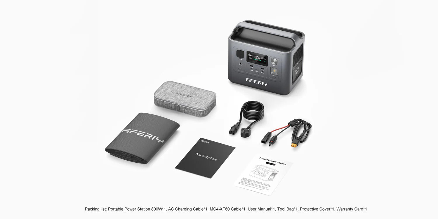 AFERIY Tragbarer Batteriegenerator hat internationale Sicherheitszertifizierungen wie CE, FCC, PSE, ROHS, 3C, UN38.3 und MSDS erhalten. Ab dem Kaufdatum des Produkts gewähren wir eine kostenlose 7-Jahres-Garantie und einen lebenslangen Kundendienst. Packliste: tragbare Powerstation 800 W*1, AC-Ladekabel*1, MC4-XT60-Kabel*1, Bedienungsanleitung*1, Werkzeugtasche*1, Schutzhülle*1, Garantiekarte*1.