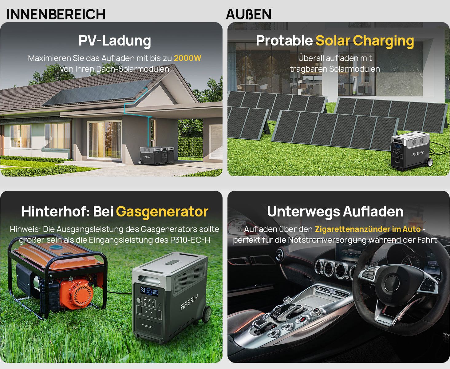 Die P310 unterstützt fünf verschiedene Lademöglichkeiten, darunter einen 2000W-Schnellladestrategie via Solarenergie, die eine 100%-Ladung in nur 2 Stunden ermöglicht. Mit einem zusätzlichen AC-Schnelllade-Modus (1100W) erreicht die Station in nur 105 Minuten von 0 % bis 85 % Ladung. Diese hybride Ladeoption eignet sich hervorragend für den Einsatz mit Solarpanels, ob als solar generator mit solarpanel oder als solar akku speicher, und ist ideal für Camping-Solaranlage Komplettsets.